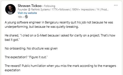 The story was shared by Shravan Tickoo, founder of an AI startup in Bengaluru, who wrote about the techie’s experience in a heartfelt LinkedIn post. Tickoo clarified that the young engineer didn’t leave because he was underperforming, but because the constant stress and lack of support at work left him emotionally exhausted.