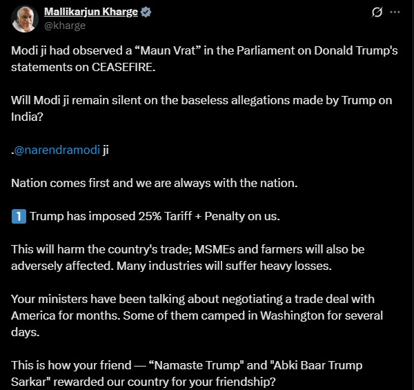 “This is how your ‘Namaste Trump’ friendship has been rewarded—with tariffs and penalties,” Kharge said on X.