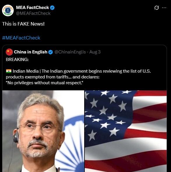 Amid rising trade tensions with the United States, India’s Ministry of External Affairs (MEA) has moved swiftly to dismiss fake reports circulating online. These reports claimed that New Delhi was reviewing the list of U.S. goods exempted from tariffs and reconsidering bilateral agreements with Washington.