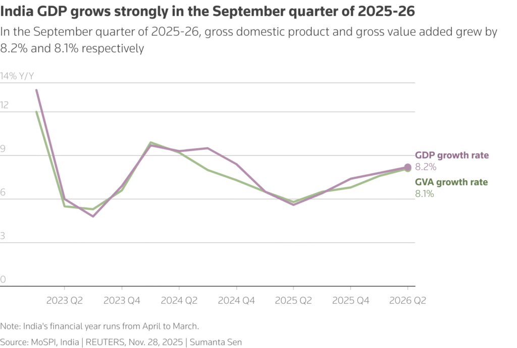 India’s economy grew 8.2% year-on-year between July and September, outpacing expectations and registering its fastest expansion of the financial year despite the United States imposing steep punitive tariffs on Indian exports.