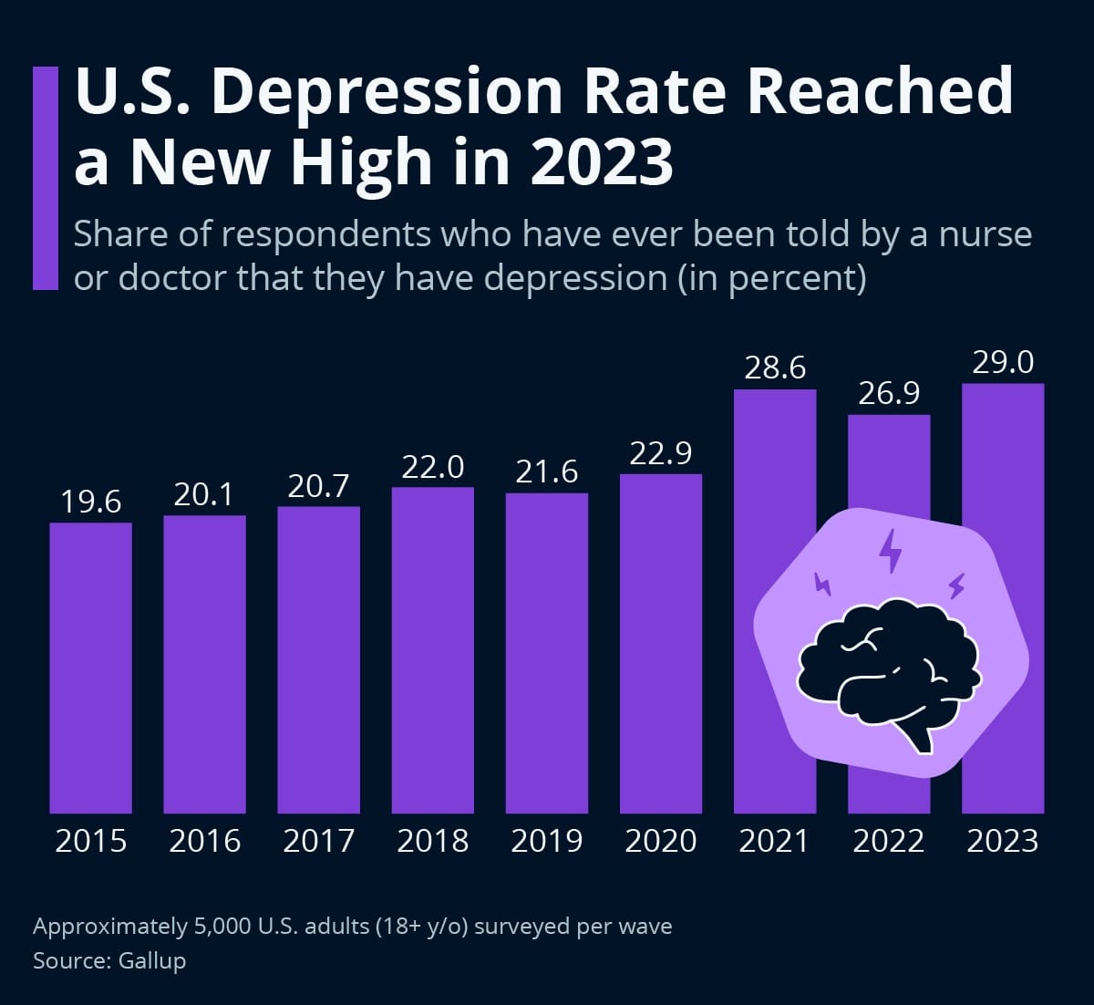 According to Gallup, the U.S. depression rate reached an all-time high of 29% in 2023, underscoring a growing public health crisis. The demand for mental health medications, including antidepressants and anti-anxiety drugs, is rising rapidly.